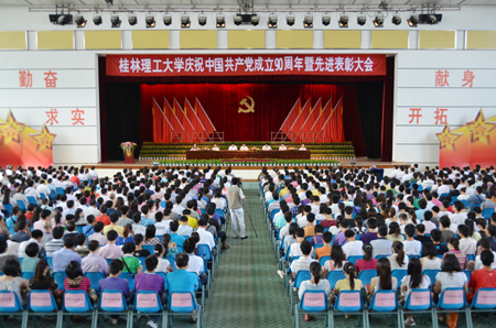 7月1日上午,学校体育馆三楼花团锦簇,红旗鲜艳,庄严隆重,学校纪念中国共产党成立90周年暨表彰大会在这里举行。学校党委书记赵艳林,党委副书记、校长张学洪,党委副书记、纪委书记赵君,党委副书记王赣华,副校长陈学军,党委委员、校长助理、人事处处长华桂林,党委委员、组织部部长陈贵英出席大会并在主席台就坐。学校全体党员、民主党派代表、无党派代表参加会议,大会由学校校长张学洪主持。 大会在庄严的国歌声中拉开序幕。学校党委副书记赵君宣读了自治区高校工委、桂林市委和学校党委关于表彰先进基层党组织和优秀共产党员、优秀党务工作者的决定,在主席台就坐的领导为获得表彰的先进集体和先进个人颁奖。学校先进基层组织代表——材料科学与工程学院教工党支部书记余传柏同志,学校优秀共产党员代表——地球科学学院副院长缪秉魁同志,学校优秀党务工作者代表——党委学生工作部部长熊英同志分别作了获奖发言。 会上,赵艳林书记代表学校党委向全校各级党组织和广大共产党员致以节日的亲切问候,向受到表彰的先进集体和先进个人表示热烈祝贺。赵书记在讲话中与广大师生党员代表一同回顾了党的90年峥嵘岁月和奋斗历程,并认真总结了50多年来在学校党委的领导下学校改革发展所取得的重要成绩。赵书记指出,学校当前正处于全面推进建设特色鲜明高水平理工大学的关键时期,我们纪念建党90周年,最好最大的实际行动,就是继承和发扬党领导人民在长期实践中创造的宝贵经验和伟大精神,把建设中国特色社会主义的伟大事业不断推向前进;就是要继承和发扬历代桂工党员师生在长期的办学实践中创造来的宝贵经验和办学成就,把建设特色鲜明高水理工大学的目标不断推向前进。赵书记要求全校各级党组织和广大党员要围绕学校中心任务抓好党建工作,为建设特色鲜明高水平理工大学提供坚强保障:一是要明确责任,时刻牢记共产党人的崇高使命。要站在新的历史起点上,结合学校发展的实际,抓住和用好重要的战略机遇期,加快学校的建设和发展。二是要率先垂范,在建设特色鲜明高水平理工大学的实践中体现党的先进性。要带头爱岗、敬业、实干、奉献,充分发挥先锋模范作用,始终保持与时俱进的品质,始终代表最广大师生群众的根本利益。三是要牢记宗旨,始终保持党同人民群众的血肉联系。要紧密联系我们党员的自身思想和工作实际,加强学习和锻炼,努力增强我们履行责任、解决问题、做好工作本领,努力在本职岗位上奋发有为,艰苦奋斗,无私奉献,推动本单位、本部门和学校工作特别是与师生群众关系密切的民生和民心工程的落实,努力创造出无愧于师生群众的业绩。四是要巩固深化,继续深入推进创先争优活动开展。要结合实际,紧紧围绕学校党委提出的“争当育人先锋,共创一流业绩,建设特色鲜明的高水平理工大学”这一主题,以服从和服务于学校建设发展大局和学校的改革发展稳定为着力点,切实加强对创先争优活动的领导,引导和激励全体共产党员和师生员工在各自工作岗位上,以更加豪迈的激情、更加坚定的步伐,承前启后、继往开来,艰苦创业、奋发进取,为建设特色鲜明高水平理工大学而努力奋斗,以优异的成绩迎接党的十八大的胜利召开! 大会结束后,学校组织大家集体收看了中央庆祝中国共产党成立90周年大会现场直播。