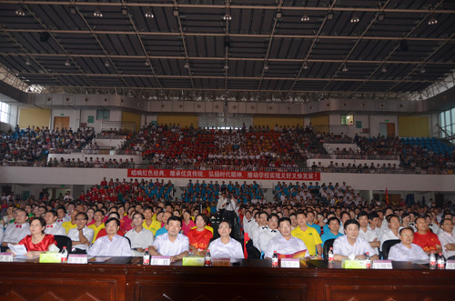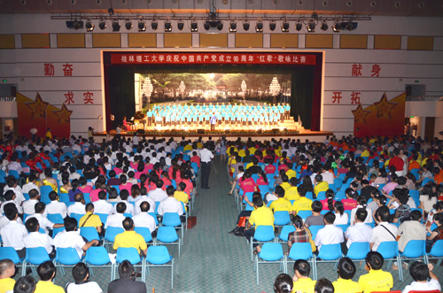 为庆祝中国共产党成立90周年,积极营造“唱红歌、颂党情”的良好氛围,由学校党委主办,党委宣传部、校工会承办的教职工红歌合唱比赛于6月29日晚在屏风校区体育馆三楼隆重举行,由学校各分会组成的二十一个合唱队参加了比赛,他们用饱满的热情、嘹亮的歌声,为党90岁生日献上了最美好的祝福。 校党委书记赵艳林,校长张学洪,党委副书记、纪委书记赵君,党委副书记王赣华,副校长陈学军,党委委员、校长助理、人事处处长华桂林,党委委员、组织部部长陈贵英等参加并观看了比赛。 晚上7时零1分,在全体与会人员的倒计时声中,比赛正式召开。 赵君副书记代表学校学校党委、行政对此次活动表示热烈祝贺!向一直以来关心、支持和参与学校建设发展的全校师生员工和离退休老同志表示衷心感谢!向全校共产党员道一声节日快乐!他在致词中说:中国共产党成立90年来的历史反复证明,没有共产党,就没有新中国的独立和富强;没有共产党,就没有人民的自由和幸福;没有共产党,就没有中国的社会主义现代化!历史无可雄辩地证明着:中国共产党是伟大的、光荣的、正确的党!在中国共产党领导全国人民建设发展的历程中,学校坚持党的正确领导,坚持社会主义办学方向,抢抓机遇,攻坚克难,实现了科学发展、和谐发展、跨越发展,学校各方面工作取得了喜人的成绩。 随后,各分会合唱队以一首首耳熟能详的经典红歌,歌唱心中的红色记忆,抒发对党和祖国的深情祝福,唱出了全体桂工人在学校党委的坚强领导下建设特色鲜明的高水平理工大学的决心与信心。比赛现场气氛热烈,台上教职工精神饱满、气势激昂,台下掌声如潮,其乐融融,呈现出欢乐祥和的气氛,此起彼伏的掌声欢呼声将歌咏比赛一次次推向高潮。 经过评委们客观、公正的评判,机关二分会、联合分会、体育教学部分会组成的合唱队和艺术学院分会合唱队荣获本次歌咏比赛的一等奖;机关一分会、外国语学院、土木与建筑工程学院分会合唱队获二等奖;材料科学与工程学院、化学与生物工程学院分会组成的合唱队,人文社会科学学院、马克思主义学院分会组成的合唱队,附属小学,博文管理学院,离退处等分会合唱队获三等奖,校领导给各获奖代表一一颁奖并合影留念。 本次比赛,大家以唱红歌为契机,把对党的无比热爱,对祖国的无限忠诚和对事业的不懈追求,融入美妙的歌声中。用歌声抒发他们的爱国之情、爱党之情和爱校之情,用红歌主旋律,营造桂林理工大学健康、向上、团结、奋进的良好氛围,激发全体桂工人的昂仰斗志,为建设特色鲜明的高水平理工大学而不断奋斗!
