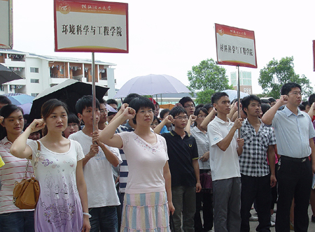 6月30日下午,我校2011年“永远跟党走”主题暑期社会实践活动启动仪式在雁山校区三栋广场举行。学校党委副书记王赣华,学工处、校团委相关负责人和学校专职团干出席了本次活动。启动仪式由校团委书记辛立章主持。 启动仪式上,校团委副书记周国桥对学校2011年暑期社会实践活动进行了工作安排。社会实践团学生代表和指导教师代表先后作了发言。参加启动仪式的实践团队成员进行了宣誓。 学校党委副书记王赣华在启动仪式上发表了讲话。他代表学校党委、行政向积极参与社会实践活动的师生们致以亲切的问候和良好的祝愿,充分肯定了近年来我校开展社会实践工作所取得的成绩。他指出学校团委以“永远跟党走”为主题组织开展今年的暑期社会实践活动,是按照上级和学校党委的要求,贯彻落实胡锦涛总书记给北京大学第十二届研究生支教团成员回信精神,促进青年学生向实践学习、向人民群众学习的有效形式,是深化实践育人工作的切实举措。他希望同学们精心组织,确保安全,高举“永远跟党走”的旗帜,在社会实践中进一步坚定永远跟党走的信念,更加自觉的向实践学习、向人民群众学习,不断地丰富阅历、磨砺意志、增长才干。 随后,王副书记给各实践团队授予了实践团团旗。 据悉,我校2011年大学生暑期社会实践活动采取团队集中实践和个人分散实践相结合的方式,通过政策宣讲、志愿服务、科技下乡等形式,引导青年学生坚持理论联系实际,实现“受教育、长才干、做贡献”,以实际行动庆祝中国共产党成立90周年。