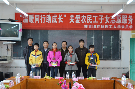 捐赠仪式上,临桂县中庸乡中心小学负责人介绍了学校和农民工子女的基本情况,临桂县委常委、县委办公室主任李先赠致辞,对我校团委开展关爱农民工子女志愿服务和捐赠活动表示感谢,希望通过这项活动能够帮助更多农民工子女,他希望受助学生能自强不息,志存高远,努力把各界的关爱化为动力,勤奋学习,立志成才。