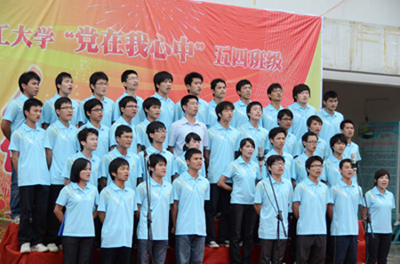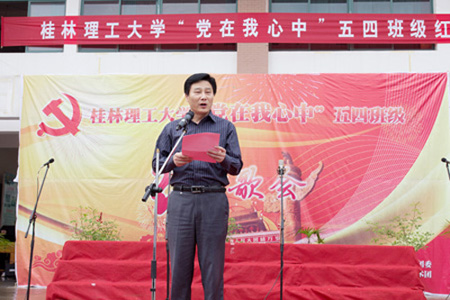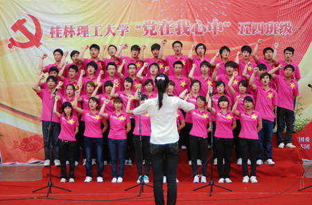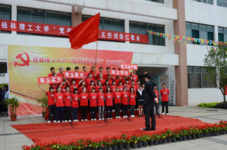 宜将青春献中华,莫让韶光付东流;红歌声声唱不尽,情深意长颂党恩。为隆重纪念“五四”运动九十二周年,喜迎中国共产党诞辰九十周年,由学工部(处)、校团委主办的 “党在我心中”五四班级红歌会于5月7日上午在雁山校区三栋广场隆重开赛。学校党委副书记王赣华观看了红歌会并作重要讲话,党委组织部,党委宣传部、统战部,党委学工部,校团委负责人及各学院副书记或副院长观看了红歌比赛并担任评委。 校党委副书记王赣华在活动致辞中讲到:红歌会活动自开展以来,老师和同学们始终以极大的热情参与其中,在校园内掀起了“红歌热”。同学们用艺术的形式表达了对“五四精神”的景仰,展示了爱党爱国情感、抒发了爱党爱国热情,他希望在红歌的感召下,同学们把爱党、爱国之情转化为励志强国之举,坚定跟党走中国特色社会主义道路的理想信念,热爱生活,勤奋学习,扎实工作,以实际行动为中国共产党建党九十周年献礼。 经过各学院初赛的严格筛选,共有十四个班级凭借雄厚的实力代表各学院入围本次比赛。参赛各班以洪亮的歌声,整齐、统一的着装,良好的精神面貌和有序的入场在比赛中打动了在场的评委和观众,赢得了场下观众的阵阵掌声。各学院辅导员老师或班导师也积极参与红歌比赛,极大地鼓舞了本学院或班级学生的比赛热情。 经过两个多小时的激烈角逐,艺术学院凭借气势磅礴的开场白、新颖独特的伴奏、整齐而充满创意的动作、精彩的彩带舞伴舞、声情并茂演唱的《保卫黄河》和《国家》赢得了全场的最高分并荣获本届红歌会的一等奖。管理学院演唱的《南泥湾》、《我的中国心》和材料科学与工程学院演唱的《祖国不会忘记》、《歌唱祖国》也以其洪亮动听的歌声和创意的伴舞分列总成绩的第二、第三名并荣获红歌会二等奖。信息科学与工程学院、理学院、应用技术学院荣获三等奖。此外,外国语学院、土木与建筑工程学院等八个学院获得优秀奖。 一首红歌一面旗,一支红曲一把号。本次红歌会上经典的红歌得到了精彩的演绎和再现,广大师生的心灵也接受了一次党的革命传统和 “五四”的精神情怀的洗礼。正如红歌会上同学们的豪迈决心:家事国事天下事,我们用青春去奉献;风声雨声读书声,我们用热血去传承。此次红歌赛对弘扬爱党、爱国情怀,促进传承与创新的校园文化建设必将起到积极的作用。