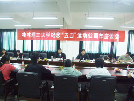5月4日下午,学校在雁山校区举办纪念“五四”运动92周年座谈会。学校校长张学洪出席座谈会并发表重要讲话。青年教师和学生代表30余人参加了座谈会。座谈会由校党委副书记王赣华主持。