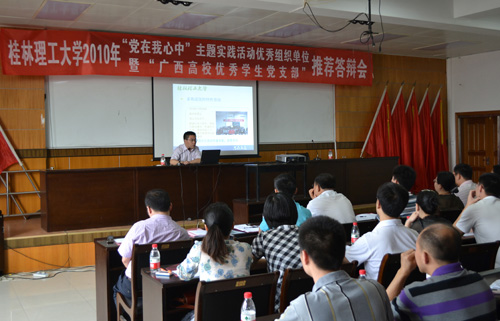 为切实做好2010年“大学生党的基本知识教育工程”总结工作, 4月28日上午,党委组织部组织召开2010年“党在我心中”主题实践活动优秀组织单位暨“广西高校优秀学生党支部”推荐答辩会。党委组织部、学工部、各二级学院党委相关负责人参加答辩会并担任评委。