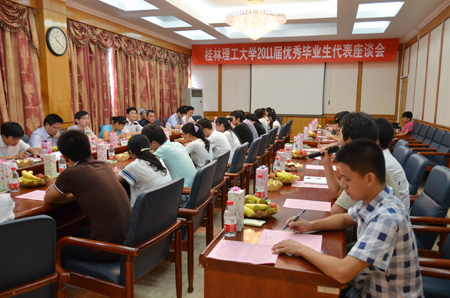 6月20日上午,我校2011届优秀毕业生代表座谈会在屏风校区教八栋三楼会议室召开。学校党委副书记王赣华出席会议。参加会议的还有学工部(处)、校团委、教务处、研究生处、招生就业处、财务处、图书馆、现教中心、后勤处、校医院等部门负责人。 座谈会上,王赣华副书记首先向获得自治区和学校“优秀毕业生”荣誉称号的同学们表示热烈祝贺,希望同学们在今后的学习工作中,继续发扬“桂工精神”,为母校争光,为社会做贡献。同时,他还真诚希望广大同学从自己的角度对学校各方面的建设发展提出意见和建议。 参加本次优秀毕业生座谈会的同学均是来自考研深造、成功推免研究生、开拓创业、西部志愿服务、留校工作等各类优秀学生代表。座谈会上,佘华煜等29名同学结合自身情况纷纷发言,畅谈自己的成长经历,表达对母校精心培育的感恩之情。同学们还围绕日常教学、教辅服务、考研指导、学生思想政治教育和日常管理、就业指导服务、后勤服务等方面的工作提出了不少建设性的意见和建议。 最后,王赣华副书记代表学校党委、行政感谢同学们对学校各项工作的关心和建言,并希望同学们作为母校的优秀毕业生代表,能够时刻不忘母校的培育之情,常怀感恩之心,报效祖国,做对社会和人民的有用之材。