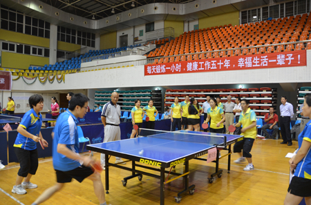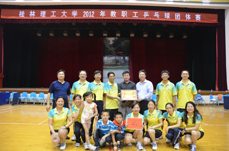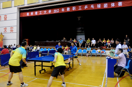 由学校工会、体育教学部联合举办的2012年桂林理工大学教职工乒乓球男、女团体赛,于5月28至31日在学校屏风校区体育馆三楼隆重举行。全校25个基层分工会组队参赛,有250多名教职工参加了本次比赛,此次比赛也是我校历次乒乓球团体赛参赛队伍和参赛人员最多的一次,是我校广大教职工乒坛爱好者的一次盛会。本次比赛得到了学校领导的大力关心指导,学校党委副书记赵君,副校长陈学军、吴志强亲临比赛现场为选手加油鼓劲。 学校党委副书记、纪委书记、工会主席、大赛组委会主任赵君,学校工会副主席、大赛组委会副主任陆平,学校体育教学部主任、大赛组委会副主任冯玉斌以及各有关单位负责人出席了闭幕式。赵副书记分别为获奖代表队颁发了奖状和奖金,他对工会、体育教学部的精心组织和全体裁判员、教练员、运动员和工作人员的协调配合给予高度评价,希望工会坚持多开展各种形式和喜闻乐见的文体活动,尽可能使更多的教职工参加基层分会和学校工会组织的活动,把群众健身活动搞得红红火火、热闹开心,健身强体。 本次团体赛采取了分组循环与交叉赛决定名次,每场比赛采取五局三胜制。经过四天84场激烈而紧张的角逐,地球科学学院代表队凭借强劲实力荣获团体赛冠军,校医院队荣获团体赛亚军,材料科学与工程学院队荣获季军;四至八名分别被机关二分会、体育教学部、图书馆、理学院、机关一分会摘取。 本次比赛气氛热烈,自始至终吸引着众多乒乓球爱好者热情助威,参赛的各代表队都以顽强的斗志和娴熟的技艺打出了自己的最好水平,整个比赛高潮迭起、精彩纷呈,尽管连续四天、二个阶段作战,各队队员都不顾疲劳、坚持打完最后一场比赛,充分显示了教职工乒乓球运动员的拼搏精神和顽强斗志,也表明了乒乓球运动在我校教职工中有着广泛的群众基础。这次比赛的成功举办,对于活跃校园文化氛围,构建和谐校园,提高我校教职工的乒乓球水平,增强各单位教职工的交流和友谊起到了积极作用。