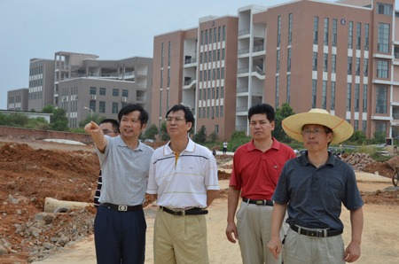 9月1日上午,为迎接2011级新生的到来,赵艳林书记、陈学军副校长在党(校)办、基建处等部门负责人的陪同下来到雁山校区二号食堂及二号组团学生公寓,实地查看学生食堂和学生公寓的施工收尾工作。 在施工现场,陈学军副校长、刘宜河处长向赵艳林书记汇报了各项施工的具体进展情况。赵艳林书记代表学校党政对暑期依然奋战在工程建设一线的建设者们表示感谢,并仔细询问、查看了施工现场的线路管道铺设、内部装修、周边环境绿化配套及周边环境下一步规划等情况,叮嘱大家要强化施工工艺,注重施工细节,加强督查、严格质量、确保工期,以干净、舒适、完备的食宿环境迎接2011级新生的到来。 之后,赵艳林书记一行又来到科技综合楼和学府雁苑教职工住宅楼等建设工地视察,在学府雁苑教职工住宅楼建设工地,赵艳林书记一行查看了工程的进展情况,要求各有关方面通力合作,全力以赴,努力做好这项惠民工程。