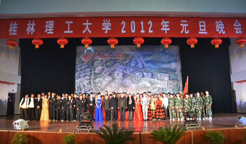 在元旦佳节到来之际,我校于12月30日、31日晚分别在屏风校区体育馆和雁山校区体育训练馆隆重举行2012年元旦晚会。学校党委书记赵艳林,校长张学洪,党委副书记、纪委书记赵君,党委副书记王赣华,副校长肖岳峰、陈学军、吴志强出席并观看了屏风校区的文艺晚会。王赣华副书记、陈学军副校长还出席了雁山校区的文艺晚会。全校数千名师生观看了晚会。 赵君副书记、王赣华副书记分别在屏风校区和雁山校区的晚会上致辞,代表学校党委、行政向广大师生员工送去节日的祝福。他们总结了我校2011年一年来所取得的骄人成绩,充分肯定了广大师生在过去一年里的辛勤努力,并对我校2012的各项工作寄予了美好的期望,希望全校师生在新的一年里团结奋进,拼搏进取,为建设特色鲜明高水平理工大学贡献力量! 晚会会场气氛热烈,节目精彩纷呈。欢快的舞蹈《神州欢腾贺新春》拉开晚会的帷幕;歌伴舞《我和我的祖国》道出了桂工师生的爱国情怀;灵动的音符,动人的旋律,乐器合奏《茉莉花》、诗歌朗诵《写给青春》与一支《西班牙之火》更是将青春的活力点燃;男女合唱《爱在天地间》的感人歌声温暖了在场观众的心房;我校外国留学生的合唱《Remember this night》让我们记住了这个欢快的夜晚,希望在新的一年里珍惜所拥有的每一天;《梨花颂》、《弹起我心爱的土琵琶》,我校教师以各自的方式为全校师生送去欢乐和祝福,整场晚会在欢乐祥和的氛围中落下帷幕。 晚会期间,校领导赵艳林、张学洪、赵君、王赣华、肖岳峰、陈学军、吴志强还上台参加抽奖游戏,为在场的师生送去新年祝福。 悦耳的歌声和曼妙的身姿演绎了炫舞飞扬的晚会,激情的掌声和愉快的欢呼点缀着流光溢彩的夜晚。在这样欢乐的夜晚,大家一起送走硕果累累的2011年,在全校师生的祝福下,迎来满怀希望的2012年,让我们带着对新年的美好憧憬,踏上新的征程,祝愿桂林理工大学明天更美好!