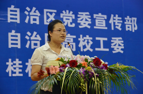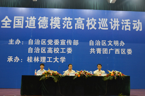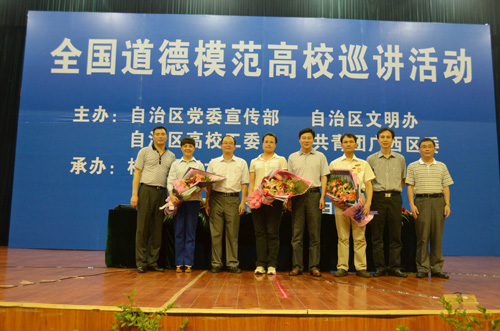 美德满八桂,馨香传桂工。6月9日晚,由自治区党委宣传部、自治区文明办、自治区高校工委、共青团广西区委主办,我校承办的“全国道德模范高校巡讲活动”桂林理工大学专场报告会在我校雁山校区体育训练馆隆重举行。 报告会邀请了全国第一届见义勇为模范、广西宾阳县宾州镇宾州一中教师谢芳秋,第一届全国道德模范提名奖获得者、柳州市恒达巴士公司营运服务部副经理邓红英,第一届全国道德模范提名奖获得者、玉林市民政局副局长梁启波等三名道德模范代表来我校为全校师生作道德模范事迹报告。 校党委副书记王赣华,自治区区党委宣传部精神文明建设活动处处长黄云龙,校团委书记辛立章,桂林市委宣传部精神文明建设活动科科长蒋小军等出席报告会。参加报告会的还有我校各二级学院党委副书记、团委书记、辅导员老师及三千余名学生。报告会由校党委宣传部秦宏毅部长主持。 当晚8时整,当三位道德模范徐徐步入会场,现场的师生对他们的到来报以热烈的掌声。王赣华副书记为本次道德模范事迹报告会致辞。他指出,“全国道德模范高校巡讲活动” 是弘扬“助人为乐、见义勇为、孝老爱亲、诚实守信”等中华民族传统美德的盛会。此次报告会来我校巡讲,为我校师生全面了解、深入学习全国道德模范先进事迹提供了一次难得的好机会,学校将以本次活动为契机,把学习道德模范先进事迹与加强师德师风建设紧密结合起来,把学习道德模范先进事迹与进一步加强和改进大学生思想政治教育紧密结合起来,引领大学生传承中华民族传统美德,践行社会主义核心价值体系。最后,他预祝报告会圆满成功。 报告会开始前与会师生观看了模范们的优秀事迹短片介绍。出生于广西宾阳县双桥乡一个小山村的贫困家庭的谢芳秋,16岁时候因为救一位横穿铁轨的聋哑老人而被疾驰的列车拖行10多米,右腿被无情的车轮轧过,谢芳秋的生活也因飞来横祸而更加艰难。然而她并不后悔,她的一句“能用我的一条腿救回一条人命,我不后悔!”深深触动了在场同学。其乐观向上、自强不息的精神也让她在2006年6月的广西第六届残疾人运动会上,一举摘得3枚游泳金牌,创造了属于自己的奇迹。谢秋芳在演讲即将结束时说到:“我会继续奋发图强迎接美好的生活,希望残疾人朋友们加强自身技能,努力奋斗,为祖国美好的明天贡献自己的一份力量。”她积极与乐观的人生态度,成为在场师生学习的标杆。 邓红英在普通的岗位上却做出不平凡的业绩。她1987年进入柳州公交公司,2000年加入中国共产党,先后荣获“八桂工人之星”“全国三八红旗手”“全国职工职业道德建设十佳标兵”等称号。她视岗位为生命,把真诚献给乘客,始终如一践行“一言一语暖乘客心坎,一心一意为乘客着想,一举一动对乘客负责,一点一滴解乘客所难”的服务格言,甘当“老人的儿女,小孩的阿姨,盲人的拐杖,外地人的活地图”。邓红英认为“服务不仅仅是一门工作,更是一门艺术,以微笑拉近距离、营造和谐”,并且坚信“用爱心和微笑能够消除矛盾,赢得尊重。” 梁启波是一名民政单位的公务人员,把“群众的安危冷暖大过天”作为民政工作的最高准则:长期扎根基层,悉心照料孤寡老人,资助特困户建房,筹款修建敬老院,亲手为10多位孤寡老人料理后事。在会上,他谈到“无论我在什么岗位,我都要兢兢业业,服务群众。”他全身上下透出的一股自信,是一名基层工作者不卑不亢的骨气,是和与百姓同呼吸、共命运的觉悟的体现。 报告会期间,我校青年教师代表管理学院沈菲菲老师和信息科学与工程学院电信11-2班黄原浩、管理学院会计10-2班的汪畅两位学生代表分别上台对三位道德模范致以崇高的敬意,并表达了自己对他们精神的感受及认识。黄原浩同学说:“在听了道德模范们的报告后,我明白了很多做人道理。作为一名在校大学生,在今后的道路上,我们应该向他们学习,担当起大学生应有的责任。”沈菲菲老师表示:“敬业是奉献,是责任,更是美德,也已成为一种时代精神,无论是老师还是学生,我们都应该向道德模范们学习,用实际行动践行社会主义核心价值理念,践行雷锋精神,桂工精神。”汪畅同学说到:“我们应该学习模范们一丝不苟、无私奉献的精神,用信念、热情、认真和细心来对待我们的学习和工作,争取将来在平凡的岗位上做出不平凡的成绩。” 道德模范的感人事迹引起了现场广大师生的强烈共鸣,掌声经久不息。会后,地球科学学院资源勘探技术11-2班王俊斌表示:“听到道德模范们的事迹后很感动,更是坚定了我学习雷锋精神,弘扬道德文化的信念。”行政管理11-2班的吴贤峰同学则表示,他们的报告给我们带来了心灵的洗礼,作为90后的我们应该要尽到大学生应有的责任,做到无愧于心。 据悉,从5月30日至9月中下旬,“全国道德模范巡讲活动”将在广西36所高校连续进行,以感召广大青年学生积极投身学雷锋活动,争做中华民族传统美德的传承者,传承和弘扬道德文化和社会文明风尚。