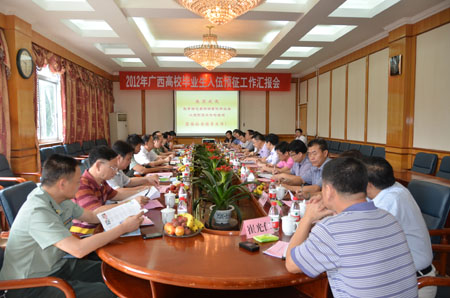 6月8日上午,广西2012届高校毕业生入伍预征工作汇报会在我校教八楼会议室召开。全国高校学生信息咨询与就业指导中心主任张凤有、总参谋部动员部参谋颜凤生、广州军区司令部参谋杨晓亮、广西军区司令部参谋覃一峰、广西高校毕业生就业指导中心主任蒋瀚洲、我校张学洪校长、王赣华副书记等领导出席汇报会。 张学洪校长对出席汇报会的各级领导表示热烈欢迎,并从学校的历史沿革、人才培养、办学特色、科学研究、师资建设、毕业生就业等方面介绍了我校基本情况。王赣华副书记从高度重视,着力构建长效工作机制、认真部署,精心组织入伍预征工作、广泛宣传,深入开展入伍预征动员等三方面介绍了我校开展高校毕业生入伍预征工作的做法和经验。广西师范大学、桂林电子科技大学、桂林医学院、桂林航天工业学院、桂林师专、桂林旅专等桂林高校代表分别介绍了各高校开展入伍预征工作的情况。 张凤有主任首先肯定了桂林各高校的毕业生入伍预征工作,并指出高校毕业生入伍是保证国家和谐稳定发展和促进我国国防现代化建设的需要。教育部高度重视入伍预征工作的开展。希望各高校通过多种方式继续加大宣传力度,保证做好预征工作。 颜凤生参谋在讲话中说,高校毕业生入伍服义务兵役,是党中央、国务院作出的重大战略决策,是改善我国兵员结构的重要举措。各高校要进一步增强入伍预征工作的政治责任感和使命感,要进一步加大宣传力度,利用毕业生离校前的最后一个月时间,进一步加强组织领导,把预征工作做实、做细,教育引导广大毕业生报名入伍预征,为国防建设做贡献。