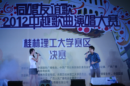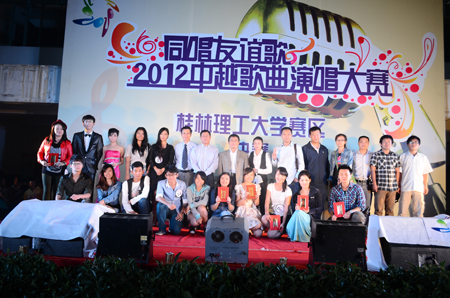 金秋十月,唱响中越。10月27日,由中国国际广播电台、自治区党委对外宣传办公室和广西广播电影电视局共同主办的“同唱友谊歌——2012中越歌曲演唱大赛”桂林理工大学赛区决赛在学校雁山校区隆重举行。此次大赛共有我校包括3名越南留学生在内的16名学生参加。同学们通过演唱一首首耳熟能详的歌曲,弘扬了中越两国人民在长期的友好交往中建立的深厚友谊,展示了我校学子良好的精神面貌,有效搭建了两国各族人民友好情感和文化交流的平台。