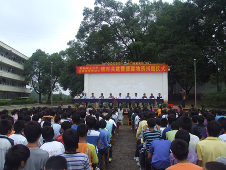 为贯彻落实中央和自治区党委关于开展创先争优活动、学习型党组织建设活动、党组织建设年活动、“结对共建、先锋同行”活动的有关精神,推进我校创先争优活动的深入开展,我校经认真调研,决定与桂林市全州县绍水镇金锣初级中学开展结对共建活动。 9月28日,我校党委书记赵艳林,党委副书记、纪委书记、工会主席赵君,党委委员、党委组织部部长陈贵英,党(校)办主任莫坷,党委宣传部、统战部部长秦宏毅,工会副主席陆平一行到金锣初中举行了结对共建仪式,并为金锣初中送去了办公桌椅、投影仪等第一批援建物资。全州县委书记贺志刚及全州教育局、绍水镇等有关单位负责人出席仪式,全州县委常委、党委组织部部长吴应新主持仪式。 金锣初中校长张祖皓在仪式上介绍了金锣初中的基本情况,学校近年来取得的优秀成绩,以及学校发展中遇到的迫切需要解决的困难和问题。他代表金锣初中全校师生衷心感谢我校的大力支持和帮助,并表示全校师生为此深受感动和鼓舞,将更加勤奋工作、努力学习,为党的教育事业和社会发展做出新贡献。 贺志刚书记向赵艳林书记一行表示热烈的欢迎,向我校对全州教育事业和经济社会发展的关心和支持表示衷心的感谢。他希望全县各有关部门要抓住机遇,主动争取结对共建单位支持,进一步理清发展思路,加强组织协调,积极主动参与创先争优活动,切实增强党员的荣誉感和使命感,激励广大党员争当“五带头”党员,在各行各业当先锋做表率,积极创建“五个好”党支部,努力实现“党员受教育、群众得实惠、党建上台阶、发展见成效”的工作目标,推动全州科学发展再上新台阶。 赵艳林书记在仪式上指出,开展结对共建活动是我校贯彻落实中央和自治区党委关于开展创先争优活动、学习型党组织建设活动、党组织建设年活动和“结对共建、先锋同行”活动总体部署的实际行动,也是学校积极服务于地方经济社会和教育事业发展的一项重要举措。结对共建仪式标志着桂林理工大学与金锣初中结对共建活动的正式开始,今后我校将发挥优势,在办学条件、师资培训等方面对金锣初中给予支持,帮助金锣初中提高教学质量和办学水平。他希望通过这次结对共建,金锣初中党支部更加重视支部建设,更好地发挥党支部的战斗堡垒作用和党员的模范先锋作用,团结带领全校教职工为培养社会主义建设事业接班人做出更大贡献。 随后举行了捐赠仪式及揭牌仪式,赵艳林书记与贺志刚书记共同为桂林理工大学“创先争优、结对共建”联系单位揭牌。 当天,赵艳林书记一行在全州县委书记贺志刚,县委常委、组织部部长吴应新及县教育局、绍水镇、金锣初中等单位有关负责人的陪同下参观了金锣初中的学生食堂、教职员工宿舍,察看了学校教学设施等情况。