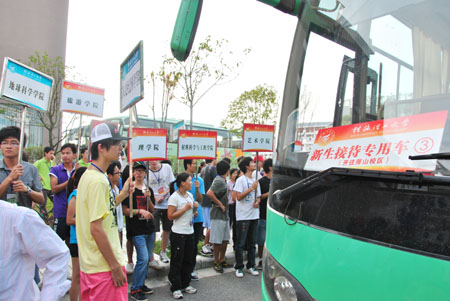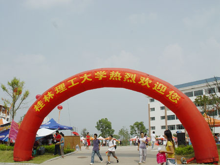 (二)迎新志愿者——骄阳下最美的花: 为迎接来自全国各地的2010级新生,围绕在他们周围的桂林理工大学的迎新志愿者也成为了一道亮丽的风景。9月11日一大早,志愿者们挂上迎新志愿的工作牌,精神抖擞开始迎新工作。 从踏入桂林的那一刻起,2010级新生便可以体会到桂林理工大和她的志愿者对自己的关心和照顾。新生报到期间,火车站、汽车站分别有桂林理工大学派出的校车和老师、志愿者在等候新生的到来。志愿者们主要负责引导出站新生们至休息候车区,并引导他们有序地上校车。 在发往两个校区的迎新车上,党员和迎新志愿者们用亲切的口吻向车上的新生以及陪同家长介绍学校的基本状况以及学校周边的环境,同时介绍桂林美丽的风景,并就安全问题和新生防诈骗问题提出忠告或建议。 来自旅游管理07—7班的丘丽笑着说,当年她踏入桂林理工大学的时候,热情学哥学姐们来她接待她,现在大四的她即将离校实习,也想象当初的学长学姐一样热情地迎接远道而来的新学弟和新学妹们。候车间隙,记者采访了一名志愿者,他告诉我们,他今天已经跑了五趟宿舍楼了。迎新工作着实累人,但他们的心情犹如一句常说的话“累并快乐着”,能帮就帮,心里感到非常满足。