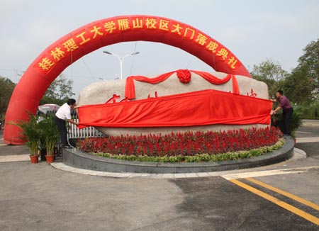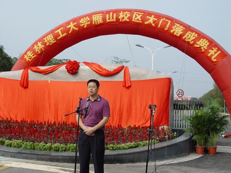 9月10日上午9点整,我校雁山校区新大门落成暨揭牌仪式在新大门前隆重举行。学校校长张学洪,党委副书记王赣华,副校长陈学军、吴志强,雁山区委常委、区委副书记石自强,雁山区委常委、区委统战部部长李红,雁山区人大副主任廖发有,雁山镇镇长谢静等雁山区领导出席揭牌仪式。仪式由陈学军副校长主持。学校部分教职工、学生代表参加了揭牌仪式。 张学洪校长在致辞中首先代表学校对支持学校建设、发展的各位领导、全体教职员工以及同学们表示衷心的感谢并向全体教师致以节日的问候。他说,学校雁山校区新大门的竣工落成标志着我校雁山新校区建设取得了阶段性的成果。目前,雁山校区建筑面积已达到26万平方米,能够同时容纳9000名学生学习、生活。现在,二期建设即将启动,希望各位领导、老师、同学能一如既往地支持学校的建设,关心学校的发展。 雁山区委副书记石自强在揭牌仪式上发表讲话。他代表雁山区委、区人大、区政府以及雁山区13.5万人民对我校新大门的落成、新校牌揭牌表示热烈祝贺。石自强副书记说,桂林理工大学新大门的落成,标志着桂林理工大学的建设进入了又一个崭新阶段;标志着雁山区在旅游通道上又多了一道风景线;标志着雁山区又多了一个醒目的新地标。多年来,桂林理工大学的发展与雁山区城区建设发展同呼吸、共命运,为雁山区的建设与发展作出了突出贡献。他相信,桂林理工大学和雁山区在未来的发展建设中一定会蒸蒸日上,日新月异,同创辉煌! 最后,张学洪校长与石自强副书记共同揭开红绸,也揭开了桂林理工大学发展新的篇章。