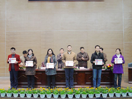 会议首先由吴志强副校长宣读了学校《关于表彰2010年毕业生就业工作先进集体和先进个人的决定》,决定授予地球科学学院、旅游学院、环境科学与工程学院、高等职业技术学院、土木与建筑学院工程等5个单位毕业生就业工作先进集体称号;授予单琳娜等55位同志毕业生就业工作先进个人称号。随后举行了颁奖仪式,在主席台就座的领导为获奖单位、个人和就业率达标的学院颁发了证书与奖金。环境科学与工程学院王敦球教授和土木与建筑工程学院谭波老师分别代表先进集体、先进个人在会上作了毕业生就业工作经验介绍与交流。