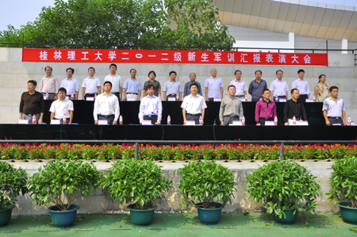 9月28日上午,在经过十多个昼夜的艰苦训练后,我校2012级新生军训的最后一次检阅——军训汇报表演在雁山校区体育场隆重举行。学校党委副书记王赣华、副校长陈学军、武警桂林市支队少校刘广门和党(校)办、宣传部、学工部、团委、武装部、教务处、后勤处及各学院主要负责人出席了汇演。汇演由学校武装部部长崔光仁主持。 早晨8点半,同学们早早地来到操场,在教官的带领下温习一遍,将技术要点烂熟于心,下一刻,他们将踏上“阅兵场”,为集体和自己争取荣誉。10时整,伴随着雄壮的《中国人民解放军军歌》,军旗缓缓进入演练场,全场起立,神情庄重。王赣华副书记在武警桂林支队刘广门少校的陪同下,依次检阅了军训各连队。同学们整齐的队列和嘹亮的口号声,展现了我校新生不畏艰苦、一往无前的气概。 各连队的分列式表演作为整个汇报表演的主体,展现的是同学们十多天来刻苦训练的成果。各连队有序入场,接受检阅,每位同学都打起十二分的精神,争取把各项动作做得更好。男生连首先入场,他们原地踏步,踢正步……这些动作都有板有眼,颇有钢铁之师的风范。女生连的同学们也都英姿飒爽,颇有巾帼不让须眉的气概。男生擒敌拳表演方队操练的气势恢宏,女生列队操表演的整齐划一,教官们近身格斗招招制敌……操场上回响着阵阵掌声。 汇报演出后,校办副主任程安福宣读《关于表彰2012级新生军训先进集体和先进个人》的决定,共有13个连队和420人获得表彰。紧接着,陈学军副校长在大会上致辞,他表达了对承训官兵的崇高敬意和对参训新生的热烈祝贺,并向新同学们提出了三点希望:一是希望同学们发扬军训期间的成果,保持良好品质;二是希望同学们明确目标,努力学习,在学校成长、成才;三是希望同学们在未来的工作中勇挑重任,不辱使命。陈副校长情真真切的话语,让同学们感受到目标明确、使命光荣。 2012级新生军训汇报表演在嘹亮雄壮的国歌中圆满落下帷幕。