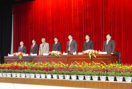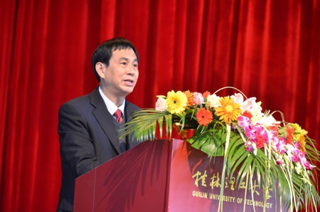 11月10日上午,在嘹亮的国歌声中,桂林理工大学建校55周年庆祝大会在屏风校区体育馆隆重召开。校党委书记赵艳林,校长张学洪,校党委副书记、纪委书记赵君,副校长陈学军、吴志强,校长助理、党委委员华桂林出席会议并在主席台就座,学校原党委书记、离休老干部、老红军柳林同志应邀出席大会。全校处级领导干部、教师和学生代表,离退休教师代表参加了庆祝大会,大会由张学洪校长主持。 赵艳林书记在庆祝大会上发表了重要讲话,他首先代表桂林理工大学党委、行政,向在学校55年发展征程中作出卓越贡献的历届学校领导、离退休老同志及全校师生员工致以崇高的敬意和节日的问候! 赵书记在讲话中,回顾了学校55年来十易校名,五改归属的艰辛发展历程及学校在人才培养、学科建设、师资队伍建设、科学研究等方面取得的伟大成就。强调55年来,学校秉承“勤奋、求实、献身、开拓”的校训,积淀、形成了优良的办学传统,并凝炼、升华为“艰苦创业、敬业奉献、团结协作、开拓创新”的“桂工精神”,正是这种弥足珍贵的精神财富,为学校的发展进步提供了强大动力和不竭源泉,激励着一代又一代桂工人立志高远、克服困难、积极进取、顽强拼搏,从而取得了今天的可喜成绩,学校由小到大,由弱变强,办学层次不断提升,办学条件大大改善,教学科研成果日渐丰硕,综合办学实力有了翻天覆地的变化。 讲话中,赵书记提出了学校未来发展规划,强调指出要以55周年华诞为新的开端,进一步增强使命感和责任感,继承和发扬学校办学的优良传统,深入贯彻落实科学发展观,全面贯彻落实全国、全区教育工作会议精神和国家和广西中长期教育改革和发展规划纲要,认真学习胡锦涛总书记在清华大学百年校庆上的重要讲话精神,以学校第一次党代会精神和学校“十二五”发展规划为指引,紧紧围绕《国务院关于进一步促进广西经济社会发展的若干意见》、《广西北部湾经济区发展规划》、《关于做大做强做优我区工业的决定》,大力发挥学校作为广西唯一一所“理工大学”的学科优势,立足于新的战略高度,着眼于新的战略目标,坚持“育人为本、质量立校、人才强校”的办学理念,以学科建设为龙头,以师资队伍建设为关键,以体制机制创新为动力,适度扩大办学规模,大力推进开放办学,巩固和提高办学特色和办学优势,提高办学层次和办学水平,以前瞻的眼光、开放的视野、务实的态度、创新的精神,全力加快建设特色鲜明高水平理工大学步伐,努力在人才培养、科学研究、社会服务和文化传承创新中创造出新的更好的业绩,为全面建设小康社会、开创中国特色社会主义事业新局面,实现中华民族的伟大复兴做出新的更大贡献! 地球科学学院缪秉魁教授代表全校教职员工在大会上发言,向挚爱的学校55岁生日致以最衷心的祝贺和最真挚的祝福!为共同拥有这样博大精深的母校而感到无比自豪!他表示,要切实肩负起立德树人、教书育人的光荣职责,关爱学生,严谨笃学,淡泊名利,自尊自律,加强师德建设,弘扬优良教风,提高业务水平,以高尚师德、人格魅力、学识风范教育感染学生,以培养优秀人才为己任,为创造学校更加辉煌美好的明天而努力奋斗!环境科学与工程学院学生时咏佳同学代表全校3万多名学子为学校55岁华诞献上诚挚的感谢和祝福,衷心感谢学校、老师们对他们的教导,并承诺将传承桂工精神,艰苦奋斗、自强不息,为学校争光,为祖国发展作出积极贡献。 55年沧桑岁月,55年拓荒耕耘,承载和见证了桂工人的光荣与梦想,艰辛与辉煌。回顾过去,硕果丰成,我们倍感喜悦;展望未来,前程似锦,我们信心满怀。相信有党和国家教育方针、政策的正确指引,有自治区党委、政府的正确领导,有广大校友和社会各界的关心支持,全体桂工人一定会负重前行而无惧,喜结硕果而不骄,孜孜以求、勇于创新、齐心协力地攀登上更加辉煌的新台阶,迎接更加灿烂的未来!