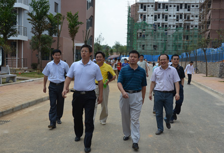 张学洪校长(前左一)、赵君副书记(前右一)、王赣华副书记(左)等在二号组团学生宿舍检查新生入住情况