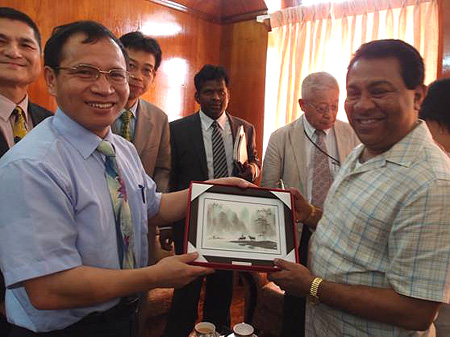 周国清副校长(左)向斯里兰卡高等教育部部长(右)赠送纪念品