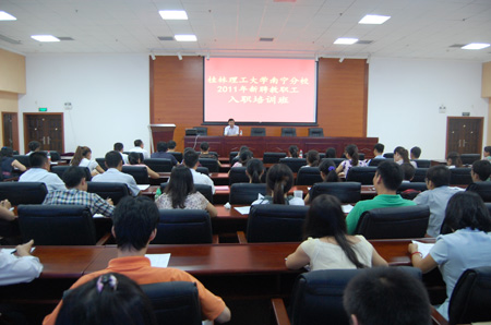 8月7日,南宁分校在3号教学楼13楼报告厅举办了新进教职工入职培训。培训班以三场讲座的方式,全方面介绍了分校的历史变迁、当前面临的形势与挑战,鼓励广大新进教职员工对未来高校教师职业生涯进行积极设计。学校党委副书记、纪委书记赵君一行看望了南宁分校新入职的教师们,并在培训班上做了专题讲座。 赵君副书记在题为《弘扬桂工精神,谱写桂工发展新华章》的讲座中介绍了我校的历史沿革和建设发展中形成的“桂工精神”,他说半个多世纪来,学校“五改归属,十易校名”,在艰苦中奋进,在艰难中进取,从小到大、从弱到强,为国家、为广西经济社会发展培养了10多万名的各类高级专门人才,为国家特别是广西的经济社会发展作出了重要贡献,也取得了诸多辉煌成就,这所有的成绩都是桂工人艰苦奋斗的结果。他希望新进教职员工继承和发扬当代“桂工精神”,抓住“十二五”发展规划这个重要的机遇,树立主人翁意识,不断提高业务能力和水平,团结协作,艰苦奋斗,在各自的工作岗位上学有所用、发挥专长,在建设特色鲜明高水平理工大学的实践中与学校事业共同进步发展! 理学院吴群英院长结合自身多年的工作经验,从教学和科研两个方面向新进教职员工介绍了做好一名高校教师所需要具备的条件。她建议广大教职员工应尽快进入教师角色,树立起良好的课堂形象,并通过多媒体工具辅助教学,不断提高自身的业务水平,以此达到教书育人的目的。她认为,教学是高校教师的立足之本,而科研则是立位之本,一个好的教师更应该是一名好的学者,通过科研促进教学。她鼓励大家进行学术研究应该像蜜蜂那样博取众长。 高等职业技术学院顾炳根院长从分校的发展历程、系部设置的不断调整优化,办学层次的定位,以及办学理念的认同等方面详细介绍了分校发展高等职业教育的情况,使广大新进教职员工深切感受到了南宁分校的发展势头和潜力。他还对学校的专业建设与课程建设、师资队伍建设等方面提出了新的要求,他希望新进教职员工能够树立正确的人生目标,把自己的人生规划和桂工的发展调整到同一条轨道上来,以此实现人生价值的最大化。 下午,南宁分校党政领导班子分成4个小组与新进教职员工召开座谈会,倾听大家的意见和建议,解答大家关心的问题,并希望新进教职员工在正确认识学校高职教育理念的前提下,为学校的发展贡献力量。广大新进教职员工一致表示,通过这些天的学习和后续的工作,他们将进一步明确了未来的发展方向,增强了自信心,大家一定要更好地继承桂工精神,在新的工作岗位上,做出更多更好的成绩。