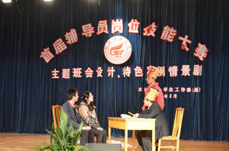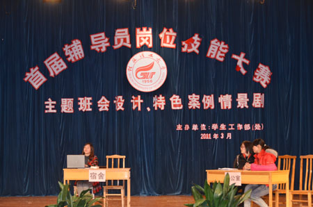 本次辅导员岗位技能大赛分为主题班会设计、特色案例情景剧、辨认学生比赛和日常管理基本知识竞赛四个主题。此次参赛的是“主题班会设计与特色案例情景剧” 两个部分,共有来自学工处、校团委和各学院近50名学工人员参赛。经过激烈的角逐后,主题班会《感恩》因设计新颖、贴近学生、可操作性强获得该主题的一等奖,并夺得“最佳创意奖”; 特色案例情景剧《梦想飞扬》因剧情贴近学生生活,内容丰富,立意深刻获得该主题的一等奖;特色案例情景剧《迷失》夺得最佳表现奖。 本次比赛较好地展现了我校辅导员们的精神面貌和学工人员的专业特点和职业特长。辅导员们真情演绎的情景剧也体现出了我校学生工作方法和思路上的开拓创新,对今后处理类似学生工作具有较好的参考和借鉴意义。