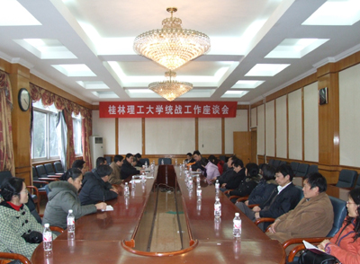 1月25日下午,学校在教八楼会议室召开统战工作座谈会。学校党委副书记王赣华出席会议,学校各民主党派领导及无党派人士代表、学校统战部领导与部门工作人员参加了座谈会。会议由学校党委统战部副部长钟克庆主持。 座谈会上,学校党委统战部部长于海平同志就学校2009年统战工作进行了总结,提出了学校2010年统战工作的指导思想、总体思路,对2010年学校统战工作进了安排和部署。民盟、九三学社、民革、民进等学校各民主党派领导先后介绍了本党派2009年组织建设、参政议政、服务社会、开展政治交接、社会实践活动等方面所取得的成绩和2010年的工作设想,与会人员还就如何进一步加强多党合作,携手并肩共同推进学校早日建成特色鲜明的高水平理工大学进行了热烈的探讨与交流。 王赣华副书记代表学校党委向各民主党派和无党派人士在过去的一年里所取得的成绩和为学校的建设与发展所做出的贡献表示热烈的祝贺和衷心的感谢,向全校各民主党派和无党派人士致以新年的美好祝福!并代表学校党委通报了2009年学校在开展深入学习实践科学发展观活动、召开党代会、“两申”目标的基本实现、教学、科研、毕业生就业、新校区建设、党建和思想政治教育工作、贯彻执行民主集中制等方面工作所取得的主要工作成绩,特别是详细通报了学校第一次党代会所确定的学校今后一个时期的发展指导思想、工作思路、办学理念、发展总体目标及实现总体目标的“三步走”战略与八大任务。王赣华副书记强调指出,为确保党代会提出的目标任务能够圆满完成,学校党委对党代会所确定的今后四年发展目标、主要工作任务进行了分解落实,并连续召开了两次处级领导干部培训班对学校全体处级领导干部就如何落实好党代会提出的目标与任务进行了专门培训,由此足见学校党委对实现党代会提出的奋斗目标的决心大、信心足、意志坚。他希望学校各党派和无党派人士,要同心同德,携手并肩,共同努力,圆满完成中共桂林理工大学第一次党代会所确定的目标与任务,为把学校早日建成特色鲜明的高水平理工大学做出新的更大贡献!