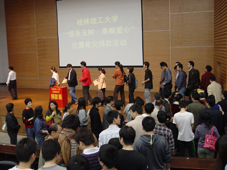 4月14日上午7点49分,青海省玉树藏族自治州玉树县发生7.1级地震,灾情造成当地巨大的人员伤亡和财产损失。灾情深深牵动着我校广大师生的心。为了表达对灾区人民的深切关爱,支援抗震救灾,帮助重建家园,4月21日下午,我校在屏风校区、雁山校区举行了“情系玉树、奉献爱心”抗震救灾捐款活动。 学校党委书记赵艳林,学校校长张学洪,党委副书记、纪委书记、工会主席赵君,党委副书记王赣华,副校长肖岳峰、阮百尧、陈学军、吴志强,党委委员、校长助理华桂林,党委委员陈贵英分别出席屏风校区和雁山校区的抗震救灾捐款活动并捐款。副校长肖明贵、周国清出差在外,专门委托他人代为捐款。 捐款前,学校领导、全校中层干部、教师和学生代表首先对青海玉树地震遇难同胞默哀。赵君副书记和陈学军副校长代表学校党委、行政分别在屏风校区和雁山校区捐款活动启动仪式上作动员讲话,号召学校各级领导干部、广大教职工和同学们向灾区人民伸出援手,为灾区同胞捐款和提供援助,支持地震灾区抗震救灾和灾后恢复重建,与灾区人民风雨同舟、守望相助、共度难关、重建家园。 在捐款活动现场,广大干部、教职工和同学们纷纷慷慨解囊,奉献爱心,以实际行动弘扬中华民族“一方有难、八方支援”的传统美德。截至下午6时,学校屏风校区和雁山校区已募捐到第一批善款69202.7元。目前,学校工会、学工处、团委、离退处组织的在职教职工、全校学生和离退休人员募捐活动仍在进行中。