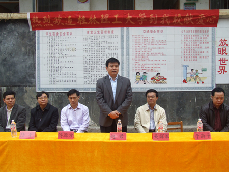 连日来,虽是阴雨绵绵,但广西旱情仍未解除,抗旱形势依然严峻。面对此情此景,我校全体师生员工感同身受、焦虑万分。4月9日,带着全校师生员工的深情厚谊,我校党委副书记、纪委书记赵君带领党办、校办、宣传部、科技处、工会、团委、南宁分院等单位、部门领导及相关负责人,沿着蜿蜒崎岖的山路,翻过一道道山梁,来到旱情较为严重的广西都安县高岭镇加庭小学进行慰问和对口帮扶,并向他们捐赠了3万元帮扶款和1吨多蔬菜。 捐赠仪式上,赵君副书记代表我校发表了讲话。他指出,加庭小学的困难一直牵动着我校全体师生员工的心,大家对此深表关切和关注。他希望大家一起共同努力,团结奋斗,共度难关。都安县委常委、副县长、宣传部长吴辉军代表都安县和高岭镇对我校的对口帮扶表示衷心感谢,并希望小学生们努力学习,不负众望,以便将来回报社会和人民。 都安县委常委、高岭镇党委书记傅源方,都安县教育局副局长唐孟,高岭镇镇长覃钫,副镇长韦芳艳,高岭镇中心校校长黄海景,加庭小学校长卢森宋出席并见证了捐赠仪式。捐赠仪式结束后,我校党委副书记、纪委书记赵君,都安县委常委、副县长、宣传部长吴辉军共同为“桂林理工大学对口帮扶都安县高岭镇加庭小学”基地揭牌。