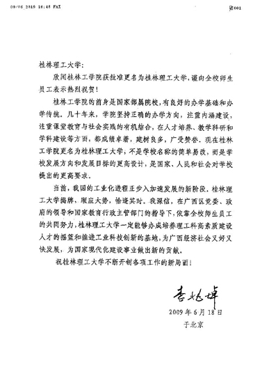 桂林理工大学: 欣闻桂林工学院获批准更名为桂林理工大学,谨向全校师生员工表示热烈祝贺! 桂林工学院的前身是国家部属院校,有良好的办学基础和办学传统。几十年来,学院坚持正确的办学方向,注重内涵建设,注重课堂教育与社会实践的有机结合,在人才培养、教学科研和学科建设等方面,都成绩卓著,建树良多,广受赞誉。现在桂林工学院更名为桂林理工大学,不是学校名称的简单易改,而是学校发展方向和发展目标的更高设计,是国家、人民和社会对学校提出的更高要求。 当前,我国的工业化进程正步入加速发展的新阶段。桂林理工大学揭牌,顺应大势,恰逢其时。我深信,在广西区党委、政府的领导和国家教育行政主管部门的指导下,依靠全校师生员工的共同努力,桂林理工大学一定能够办成培养理工科高素质建设人才的摇篮和推进工业科技创新的基地,为广西经济社会又好又快发展,为国家现代化建设事业做出新的贡献。 祝桂林理工大学不断开创各项工作的新局面!