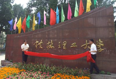 学校党委副书记张学洪(右)与党委副书记、纪委书记赵君(左)在雁山校区大门揭牌