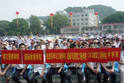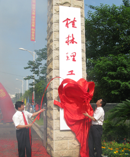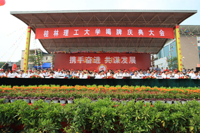 惠风和畅、生意盎然的夏至之日,持续升腾着学校成功更名给我们带来的集体荣誉感和历史责任感。葱郁宁静的校园,早已按奈不住全体师生员工激动不已的情怀,历经半个多世纪风霜洗礼后而孕育的一朵生命之花在此间嫣然绽放。6月21日上午10时,我校更名揭牌庆典大会在屏风校区体育场隆重举行,近万师生、校友、来宾欢聚一堂,共庆桂林工学院更名为桂林理工大学。全国政协副主席李兆焯发来贺信。自治区党委书记、自治区人大常委会主任郭声琨与学校党委书记黎志逘共同为学校更名揭牌。自治区主席马飚发来贺信。中国有色金属工业协会会长、党委书记康义讲话。 会上,教育部督导办副主任林仕梁,自治区党委常委、秘书长余远辉分别宣读了教育部及自治区政府关于桂林工学院更名为桂林理工大学文件。 自治区党委常委、自治区常务副主席李金早发来贺电。自治区人大常委会副主任覃瑞祥出席会议。 康义在讲话中表示,在新的发展进程中,桂林理工大学一定能够为有色金属行业及地方经济和社会发展培养出更多、更好的高层次技术和管理人才。中国有色金属工业协会将一如既往地关心、支持学校的建设与发展,尽力为学校与企业搭建沟通、交流、合作的平台,使学校有一个更好的发展空间和环境。 自治区副主席李康代表自治区党委、政府向桂林理工大学全体师生员工和海内外校友表示热烈祝贺。她说,桂林理工大学的更名,必将有利于学校保持办学传统和特色优势,有利于进一步提升人才培养、科技创新和社会服务能力,有利于满足广西对高层次工业技术人才的需要。她希望桂林理工大学以成功更名为契机,努力成为科教兴桂的生力军、科学发展的人才库、优良校风的示范者。 我校党委书记黎志逘热情洋溢地致辞。他首先向莅临揭牌庆典大会的各位领导、各兄弟单位、各兄弟院校、以及学校历任领导和远道归来的校友们表示热烈的欢迎和衷心的感谢!黎志逘书记满怀深情地说,桂林理工大学的前身是1956年创建的桂林地质学校,原是国家部属院校,1998年改为中央与地方共建。50多年来,学校走过的是一条维新自强之路,是一条闪烁着理想信念之光的探索之路,奏响的是一首团结奋进的凯歌。半个多世纪以来,学校坚持社会主义办学方向,以人才培养、科学研究、服务社会为己任,共为国家培养了10多万名各类高级专业技术和管理人才。目前,学校拥有屏风、雁山、南宁三个校区,占地面积1700多亩,建筑面积60多万平方米。现有55个本科专业,35个硕士学位授权点,5个工程硕士领域和MBA授权资格,学校被列为博士学位授权建设单位。有4门国家级本科精品课程,1个教育部重点实验室,1个教育部工程研究中心,1个国家级教学团队,2个国家级实验教学示范中心,3个国家级特色专业建设点以及一批自治区级重点实验室和教学科研平台。学校共有教师1300多名,其中教授、副教授450多名。各类在校生28000多人,其中全日制在校生17000多名,是一所以工为主,理、工、文、管、经、法、农7大学科门类协调发展的多科性大学。近年来,学校学科专业特色和优势日益凸显,社会声誉不断攀升,毕业生就业率连年居广西高校前茅,办学实力和水平显著提升,发展势头良好,前景一片光明。黎志逘书记充满感激地说,学校成功更名为桂林理工大学,是自治区党委和政府正确领导的结果;是教育部、有色金属工业协会关心支持的结果;是自治区教育厅、各市、及其他区直各单位倾力帮助和指导的结果。是全校广大师生员工艰苦创业、无私奉献、团结协作、开拓创新的结果。是学校历任领导班子打下坚实基础的结果。为此,黎志逘书记说,今天,当我们站在学校发展新的起点上,回望那沧桑岁月,我们不会忘记,当年学校的建设开拓者们,满怀一腔热血,从祖国四面八方奔赴桂林,用智慧和汗水开辟了学校发展的先河;我们不会忘记,是一代又一代“桂工人”的艰苦奋斗、团结拼搏,把一所普通专科院校建设成为在广西乃至全国负有盛名和影响力的理工大学。我们不会忘记,学校“五改归属,十易校名”所包含的时代内涵与一次次跨越。我们不会忘记,桂林理工大学是在党的阳光雨露滋润下茁壮成长起来的。他代表学校全体师生员工表示决心,要在自治区党委和人民政府的正确领导下,认真贯彻落实科学发展观,紧紧围绕自治区党委、政府关于发展广西经济的战略部署。牢记嘱托、抢抓机遇、迎接挑战,以“推动科学发展,办人民满意的理工大学”的豪迈英姿去续写新的华章。为国家西部大开发的伟大战略实践;为加快广西工业化和新农村建设步伐;为打造“西江黄金航道”,推动区域经济协调发展;为促进东盟经济自由贸易区、北部湾经济区和广西有色金属工业的建设和发展,为建设富裕、文明、和谐新广西作出新的、更大的贡献。他热忱地期盼各级领导、社会各界朋友和广大校友一如既往地关心支持学校的建设与发展;并祝愿各位领导、各位来宾、各位校友和全体师生员工身体健康、工作顺利、阖家幸福、万事如意! 高枫厅长代表自治区高校工委、教育厅肯定了学校50多年里,励精图治,开拓创新,在学科专业和课程建设、毕业生就业工作等方面成绩突出,为全区高等学校发展树立了榜样。他衷心祝愿桂林理工大学在新的征途中再谱新篇章,再铸新辉煌! 李志刚市长代表中共桂林市委、市