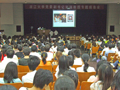 6月10日晚,浙江大学党委副书记、高分子合成与功能构造教育部重点实验室主任、浙江大学高分子复合材料研究所所长、浙江省政协委员郑强教授应我校邀请,莅临我校为师生作了《当代大学生的成才之路与历史责任》的精彩演讲。演讲会由我校党委副书记赵君主持。 南校区礼堂座无虚席,慕名而来的学生挤满了礼堂。连续三年当选为“浙大最受学生欢迎的老师”郑强教授神采奕奕。郑教授以独特的思维方式对教育制度、教育理念等进行反思,将学生的成长与国家科研发展现状结合起来,提出了学生在个人发展方面的具有创新意义的思路和措施。郑教授结合国情和国际关系,用“强哥语录”为在场师生阐述了爱党、爱国、爱校的重要性。他指出学生的未来主要由世界观、价值观和人生观决定,大学教育应更多地激发学生爱祖国、爱家乡、爱父母、爱学校的情怀,“国富不等于民强”,“没有民族凝聚力、国家就没有力量”,“民族文化是民族精神的根基、民族语言是民族文化的根本”。郑强呼吁当代大学生要关注国家民族的命运,科学家永远有他的祖国。郑教授放眼全球,以中华民族的伟大复兴为目的,为同学们阐述了当代大学生应该具有的历史责任。 郑教授诙谐的演讲风格、发自内心的话语和独特的理性思考深深打动了在场的每一位同学和老师,会场掌声不断、笑声不断,同学们享受到了一道美味的人文素质教育大餐。