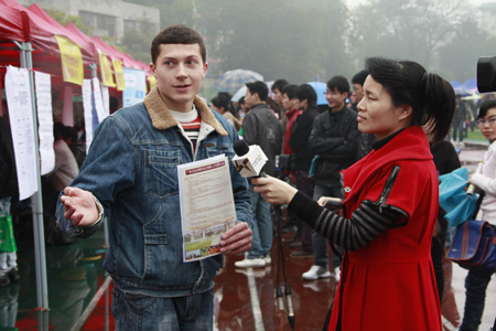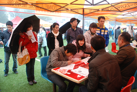 自治区就业指导中心主任蒋瀚洲(左一)等领导亲临双选会现场指导工作