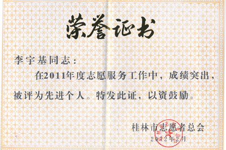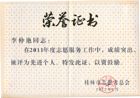 我校青年志愿者协会荣获“桂林市2011年度志愿服务工作先进集体”荣誉称号