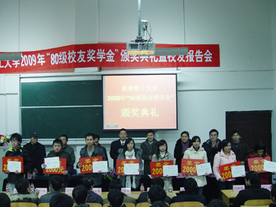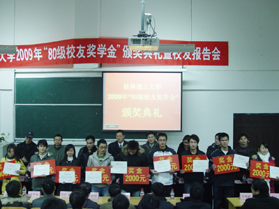 12月20日,我校2009年“80级校友奖学金”颁奖典礼在雁山校区举行。校长张学洪,党委副书记王赣华,80级校友代表张志强、蒙隆华、冯佐海、李景保、周力青、王殿华、王若晨、赖有超,校友工作办公室主任、校长办公室副主任程安福及相关单位负责人和老师出席了颁奖典礼。颁奖典礼由学工部(处)长熊英主持。 会上,王赣华副书记宣读了《关于公布2009年“80级校友奖学金”获奖学生名单的通知》,赵俐等26名同学获得学校2009年度“80级校友奖学金”,在主席台就座的领导和80级校友代表为获奖同学颁发了证书与奖金。随后,学校80级校友代表王殿华老师、获奖学生代表赵俐同学在颁奖典礼上作了发言。 张学洪校长代表学校对80级校友表示感谢,并对获奖同学表示祝贺。他强调,“80级校友奖学金”的设立旨在激励大家勤于钻研、勇于实践、开拓创新、精益求精。它不仅是一种物质帮助,更是一种精神鼓励。他希望大家以80级校友为榜样,胸怀抱国之志,常怀感恩之心,好好把握大学时光,努力奋斗,用实际行动谱写动人的青春篇章。 我校“80级校友奖学金”于2007年11月由原桂林冶金地质学院地质系80级校友张志强倡议发起,原地质系、物探系和化探系的80级校友们共同出资设立,用以帮助品学兼优、家庭经济困难的同学完成学业。三年以来,学校共有82名学生获此殊荣,其中2007年25名,2008年31名,2009年26名,发放奖学金总金额达18.9万元。 颁奖典礼结束后,80级校友天津校友会会长张志强给同学们作了以《自强、自信、自立》为题的专题报告。