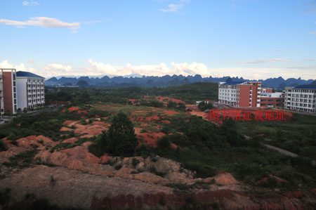雁山校区标志性建筑图书馆工程日前动工。该工程总投资7500万元,主体建筑建安费4387万元,其中利用国家开发银行贷款5000万元。合同工期490天。工程总建筑面积32600平方米。主体七层,局部二、六层,建筑总高度31.5米。采用中庭式建筑布局,一层为图书馆基本书库、借还大厅及学术报告厅,二层为大空间展厅,三至七层主要为藏阅空间,地下室为停车库和设备用房。