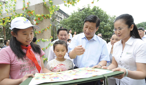 这是5月10日,习近平在南宁市青秀区新竹社区看望居民时,与小区里正在画画的孩子们一起观看她们创作的美好家园图画。新华社记者 李学仁 摄