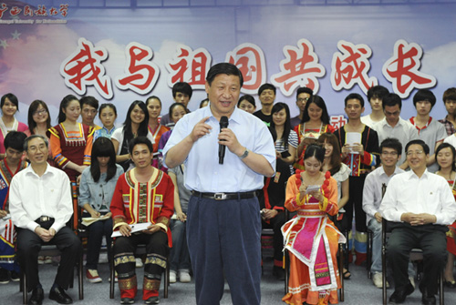 5月的广西民族大学,花团锦簇,树木成林。10日下午,习近平来到这所国家民委和广西壮族自治区共建的综合性民族高等学校。校领导介绍说,学校突出“民族性、地方性、国际性”,与多个国家互派留学生,是首批“国家外语非通用语种本科人才基地”、“海外汉语教师来华培训资助项目”执行学校。学校曾获得“党的建设和思想政治工作先进普通高校”、“民族团结进步模范单位”等称号。学校已开设7个东盟国家语种。习近平表示满意。 在“国家外语非通用语种本科人才基地”多媒体教室里,教师正在为东盟来学习的同学们讲授贺知章的《回乡偶书》和李白的《静夜思》。习近平的到来,使师生们又惊又喜,大家起立鼓掌欢迎。观摩了同学们的诗词拼接游戏后,习近平发表了热情洋溢的讲话。他说:很高兴与这么多的外国留学生交流。唐诗宋词是中国文学的精髓,学好唐诗宋词对外国留学生非常必要,也非常重要。外国留学生如果能对唐诗宋词有所掌握、领悟并加以运用,对掌握中国文化语言能力的提高就会有一个质的飞跃。希望大家利用这样一个宝贵的机会,掌握了解中国文化。希望大家学成之后成为知华友华、建立中国与东盟各国之间交往桥梁的友好使者,成为中国永远的朋友、最好的朋友! 习近平随后来到大学生活动中心,这里正在开展一场别开生面的大学生党员和入党积极分子参加的“我与祖国共成长”主题活动。同学们纷纷踊跃发言,气氛显得十分活跃,大家共同述说着自己的成长经历,倾诉着对党、对祖国的热爱之情。来自罗城仫佬族自治县的谢友进同学讲述了自己从一位贫困学子成长为一名大学生少数民族党员的艰辛历程,表示学成之后要立志建设家乡,报效祖国;来自三江侗族自治县的刘洋同学讲述了自己家乡的巨大变化、党和国家对侗乡的大力支持和帮助,自己从一名普通少数民族女孩成长为研究生的人生重大转折,她激动地用侗家山歌表示对党的民族政策的衷心拥护和感激……会场上掌声不断,笑声不断,歌声不断。 看着一张张洋溢着青春的笑脸,听着一句句感人肺腑的话语,习近平十分感动。他充分肯定了这场主题活动的作用和积极意义。他说,广西民族大学的校训是“厚德博学、和而不同”,这两句话非常精辟,涵盖很广,确实是中国哲学和智慧的精要所在。刚才几位同学说的都很好,他们求学虽然起步艰辛,但能够志存高远,倍加珍惜学习机会,立志报国,答谢党恩,我为你们的进步感到十分高兴。新中国成立以来,特别是改革开放以来,我国社会主义现代化建设取得了令世人瞩目的伟大成就,国人为之自豪。同学们要倍加勤于求学,学有所成,锻炼成才,成为社会主义事业的建设者和接班人。同学们要牢记入党为什么?就是要继承革命先烈的革命志向、理想和事业,把握中国发展的历史方位,加入到国家富强、民族振兴的伟大事业中,为中国实现现代化、为中华民族的伟大复兴而努力奋斗。我们做的每一件事情,出发点和落脚点都在于中国13亿人民的福祉。要更加坚定走中国特色社会主义道路的决心和信心,更加坚定共产主义远大理想和崇高信仰,摔打磨炼,茁壮成长。我们的国家是一个多民族的国家,中华民族是一个多民族的共同体,我们还要成为执行民族团结进步政策的楷模,为推动我们这个多民族大家庭的和谐、共同发展贡献自己的一份力量。 习近平热情洋溢的讲话,使同学们激动万分,心潮久久不能平静,大家热烈鼓掌,久久不愿离去。 5月11日上午,习近平召开自治区干部座谈会,听取了自治区党委书记郭声琨的工作汇报和桂林市、东兰县、小平阳镇的领导同志的发言。习近平充分肯定了广西经济社会发展取得的显著成绩。他说,当前广西经济快速发展,社会和谐稳定,民族团结和睦,边疆巩固安宁,人民安居乐业,干部群众精神振奋,这些成绩的取得,是在党中央的正确领导下,以声琨为班长的自治区党委和自治区人大、政府、政协几套班子,一起带领全区人民积极进取,艰苦奋斗的结果。 习近平强调,要深入实施西部大开发战略,全面提高广西经济发展水平。今后10年是深入推进西部大开发承前启后的关键时期,党中央、国务院高度重视,将专门进行部署。广西的同志要抓住机遇,认真落实中央关于深入实施西部大开发战略的政策措施,努力实现广西经济社会发展新跨越。要进一步抓好农村扶贫开发,切实加强革命老区建设。各级党委、政府要继续加大工作力度,特别要抓好边境地区、革命老区、大石山区的扶贫开发工作,确保国家扶贫开发工作重点县农民人均纯收入年均增长幅度高于全区农民人均纯收入增长的平均水平,逐步缩小城乡及农村内部收入发展差距。要认真贯彻落实党的十七届四中全会精神,进一步加强和改进新形势下党的建设。要继续以高度的政治责任感抓好十七届四中全会各项任务的落实,坚持以改革创新精神研究新情况、解决新问题、创造新经验,不断提高党的建设科学化水平。 自治区领导马飚、马铁山、陈际瓦、刘晓琨、李金早、车荣福、温卡华、陈武、石生龙、黄道伟、陈向群、余远辉、吴恒、陈章良、杨道喜、林念修、高雄、梁胜利等参加座谈会。 中央政策研究室常务副主任何毅亭,水利部部长陈雷,中央组织部副部长王秦丰,国家发展改革委副主任刘铁男陪同考察调研。 自治区党委副书记陈际瓦,自治