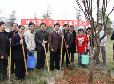 3月12日,正值第32个植树节来临之际,学校党委副书记、纪委书记赵君,党委副书记王赣华,副校长陈学军,党委宣传部、学工部、校团委及机械与控制工程学院、外国语学院领导与老师和学校青年志愿者一起,在雁山校区开展义务植树活动,师生共建绿色生态校园。 植树现场,有的铲土,有的浇水,个个充满激情。经过大家2个多小时的努力,雁山校区田径场的草坪上出现了一棵棵充满生机的绿树。看着用汗水换来的校园新装,师生们脸上无不洋溢着劳动带来的快乐。积极参与此次植树活动,不仅为校园增添了一份新绿,使校园更美,也是为全校师生营造良好的工作、学习和生活环境贡献了自已的一份力量。