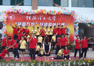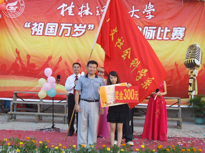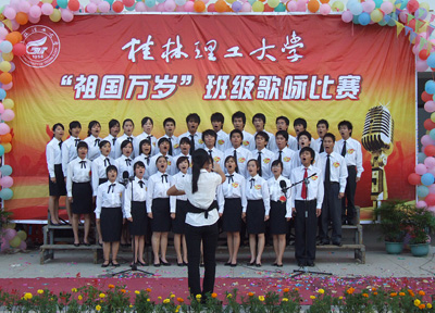 为了深入贯彻自治区高校工委《关于围绕庆祝新中国成立60周年深入开展“我爱我的祖国”主题教育活动的通知》精神,进一步加强和改进我校大学生思想政治教育,丰富校园文化活动,激发我校全体学生的爱国热情,为祖国六十华诞献礼, 7月10日下午,由校团委主办的“祖国万岁”班级歌咏比赛活动在雁山校区教三楼前隆重举行。学校党委副书记、纪委书记赵君,党委宣传部、统战部部长于海平,学工部部长、学工处处长熊英,团委书记辛立章,学工部副部长、学工处副处长张雷, 团委副书记李辉以及各学院党总支副书记、各学院分团委书记及辅导员出席了本次歌咏比赛。本次共有11个学院的班级代表队参加了比赛。 学校党委副书记、纪委书记赵君致开幕辞。赵君副书记指出,本次活动是为了在校园内进一步唱响共产党好、社会主义好、改革开放好、伟大祖国好、各族人民好的时代主旋律。对深入开展中国特色社会主义的宣传教育,深入开展民族精神和时代精神的宣传教育,深入开展基本国情和形势政策的宣传教育,深入培养同学们的爱国情操、激发同学们的爱国热情,促进学校精神文明建设具有重要意义。 各班级代表队以高昂的激情演唱了《歌唱祖国》、《没有共产党就没有新中国》、《东方之珠》等一系列爱国歌曲。现场观众都被精彩演唱所感染,现场气氛十分活跃,不时响起阵阵掌声。经过激烈角逐,人文社会科学学院行政管理07-1班以9.21的高分获得比赛一等奖;理学院统计学07-2班和管理学院BCU国际经济与贸易08-3班获得二等奖;外国语学院08-1班、材料科学与工程学院无机金属材料08-1班和环境科学与工程学院宝石08-2班获得三等奖。 本次“我爱我的祖国” 班级歌咏比赛,主题鲜明,形式新颖,亮点突出,彰显了我校大学生积极向上、爱国爱校的良好精神风貌。
