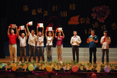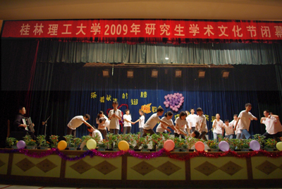 5月23日晚,我校在南校区礼堂举办了2009年研究生学术文化节闭幕式暨颁奖晚会。校长助理陈学军教授以及学工处、研究生部、团委和各院系主管研究生工作的的有关领导、老师也出席了晚会。 校长助理陈学军教授代表学校为晚会致辞。他说,研究生阶段的学习是综合能力提高的过程,是个人素养提高的过程。除了掌握扎实的专业理论知识,同学们也应在人文知识、团队精神、创新意识等方面去涉猎、去培养。希望同学们今后积极参与科技创新,参加文体活动,努力把自己塑造成国家栋梁之才。同时他希望研究生会的同学们积极工作,广泛征求研究生意见和建议,将研究生学术文化节这一研究生的品牌活动办好。最后他祝本次研究生学术文化节晚会圆满成功! 晚会的主要形式是感恩歌会,各院系的研究生献上了他们精心准备的以感恩为主题的参演曲目,如人文社科系合唱的《感恩的心》、资环系合唱的《东方之珠》、旅游管理学院独唱的《我的中国心》、材化系合唱的《相亲相爱的一家人》,等等。歌会进行中,场上场下和声共唱,展示了陶冶情操的感人诗篇,也展现了一幅又一幅的感恩画面。 晚会过程中还举行了研究生学术文化节颁奖仪式,对获得创新成果奖和在研究生授课大赛、演讲比赛、趣味竞技比赛中获奖的同学颁奖。至此,历时两个多月的桂林理工大学2009年研究生学术文化节圆满结束。 本次研究生学术文化节通过学术沙龙、导师相约、趣味竞技比赛、博士讲坛、专题培训等形式,组织了内容丰富且具有特色的研究生校园文化活动,营造了提高科技修养,培养综合素质的良好氛围。