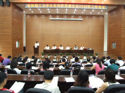 5月22日下午,我校成功更名之后的第一次社科盛会——桂林理工大学社会科学界联合会2009年工作会议在图书馆报告厅隆重召开,学校党委书记黎志逘、自治区社科联副主席张瑞枝出席大会并讲话,学校党委副书记、纪委书记、社科联主席赵君在大会上作工作报告。社科联20个团体会员单位负责人和从事社科教育研究的教师、研究生200多人参加大会。会上,在2008年度表现突出的6个先进集体、3名国家社科基金项目获得者、10名学会工作先进个人和75名学术年会论文作者受到表彰。学工处处长熊英代表先进集体、研究生处副处长蒋蓉华代表先进个人分别在会上介绍了学会建设和争取高级别科研项目的经验。 赵君同志在会上全面总结了上年度社科联工作,部署了今年学校社科联工作的主要目标和任务。自治区社科联副主席张瑞枝和学校党委书记黎志逘同志先后发表讲话,对学校社科联工作取得的成绩给予充分肯定,对获奖同志表示了衷心祝贺,对今后社科联工作提出殷切期望和要求。黎书记在大会讲话及随后的座谈中强调指出,社科联作为党委领导下的群众性学术团体,一定要发挥联系广大社会科学工作者的桥梁纽带作用,发挥主动性和创造性,积极为学校改革发展献计献策,为地方经济建设提供有价值、有高度、切实可行的决策参考和咨询服务,争取多出成果,出好成果,并在此过程中不断提高自身影响力和凝聚力,为“办人民满意的理工大学”和 “建设富裕、文明、和谐新广西”做出新的更大贡献。