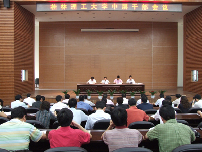 5月13日下午,学校召开中层干部会议。会议由学校党委副书记张学洪主持,学校校长赵艳林,党委副书记、纪委书记赵君,副校长阮百尧出席会议。全体副处以上领导干部参加了会议。 会上,阮百尧副校长通报了学校更名后系院调整、实验室建设方案,赵君副书记通报了雁山校区的管理情况。 赵艳林校长就学校更名大学后,如何提高认识,统一思想,推进学校的建设与发展提出了新的要求。一、进一步认识更名工作的重要性,增强抓住机遇加快发展的紧迫感和责任感。二、完善大学构架,理顺体制机制,促进学科专业建设的发展,探索管理重心下移,促进各学院的快速发展。三、全力抓好师资队伍建设,不断提高教学质量和科研水平。四、以育人为根本,不断提高人才培养质量。五、围绕博士点建设,全力推进科研工作上一个新的台阶。六、统一思想,顾全大局,团结协作,为实现学校今年各项目标而努力奋斗。赵校长还就新校区建设与管理、毕业生就业等当前工作作了部署。