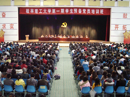 为认真贯彻落实党的十七大精神和实践科学发展观,帮助入党积极分子加深对党的基本理论和基本路线的理解,不断加强党性修养,我校自11月27日至12月12日举办了第一期学生预备党员培训班。本期培训班共培训党员1011名。培训期间,学员们积极参加党校各项教学活动,认真遵守党校各项规章制度,并开展了赴兴安红军长征突破湘江烈士纪念碑园的参观考察等党校活动。经过党校严格审核,最终有1009名学员顺利结业。会议宣读了《关于表彰桂林理工大学第一期学生预备党员培训班“优秀学员”的决定》,授予张紫文等151名同学为学校第一期预备党员培训班“优秀学员”荣誉称号。在主席台前排就坐的领导为优秀学员颁发了荣誉证书。随后,优秀学员代表农芸、夏勇超、张萌萌作了激情洋溢的心得体会交流发言。学生党员代表、校学生会主席张紫文同学带领全体学员就“创先争优”活动作出了庄严承诺。
