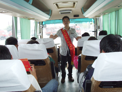 我校学生党员韦义统在车上为2009级新生及家长介绍学校情况