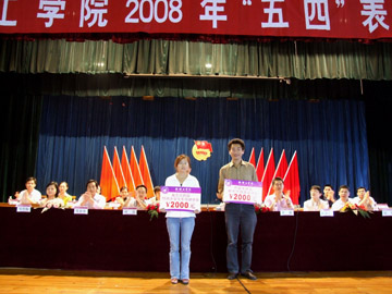5月4日下午,在庄严雄壮的国歌声中,学院2008年“五四”表彰大会在南校区礼堂隆重开幕。学院党委副书记张学洪出席大会并发表了讲话。学院团委书记辛立章,学工部副部长叶昊,全院教职工团干部及来自各系院的学生代表参加了大会。大会由学院团委副书记李辉主持。 会上,学院团委书记辛立章宣读了《关于表彰学院2008年“五四青年标兵”的决定》,学工部副部长叶昊宣读了《关于颁发学院2008年“五四自强助学金”的决定》。随后,举行了颁奖仪式。全国优秀共青团员、“中国大学生自强之星”提名奖、中国大学生新东方自强奖学金获得者朱宗强和新东方西部特困大学生专项助学金获得者高招连,学院2008年度“五四”青年标兵获得者文夏连等10名同学,学院2008年度“五四”自强助学金获得者黄艳丽等20名同学先后上台领奖,张学洪副书记和在主席台前排就座的同志为他们颁发了奖金和荣誉证书。学院2008年度“五四”青年标兵代表谢妍同学、学院2008年度“五四”自强助学金获得者代表白亚飞同学先后作了发言。 张学洪副书记首先代表学院党委向全院广大团员青年致以亲切的节日问候,向受表彰的同学表示热烈的祝贺。张副书记在讲话中指出了“五四”运动的伟大意义及“五四”精神对于一代又一代中国青年积极投身于社会主义革命、建设和改革发展事业的重大影响,并充分肯定了学院建校50多年来,在学院党委和上级团组织领导下,学院历届团委带领广大团员青年,以实际行动大力传承“五四”精神,积极投身学院的各项建设所取得的成绩和为学校所做出的贡献。他对全院广大同学提出了三点要求:一要胸怀祖国,勇担责任。 二要加强学习,增强本领。三要引领潮流,树立新风尚。“青春是充满生命力和创造力的灿烂华年,中华民族伟大复兴的神圣使命,召唤着当代青年继往开来,勇往直前。”最后,张副书记号召全院广大青年学生,要肩负起时代赋予的神圣使命,大力弘扬“五四”精神,全面落实科学发展观,以昂扬的斗志、不懈的努力,在学院的建设和发展中创造出更加骄人的青春业绩! 在充满青春活力、欢快而又激昂的中国共产主义青年团团歌声中,表彰大会圆满结束。