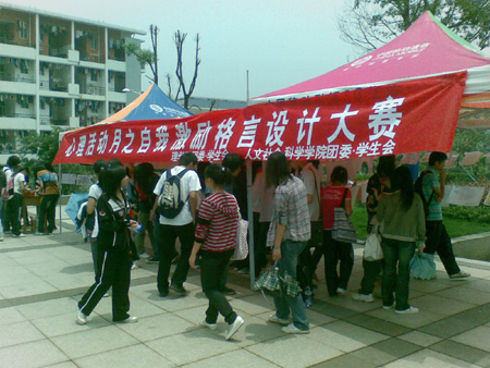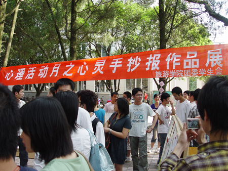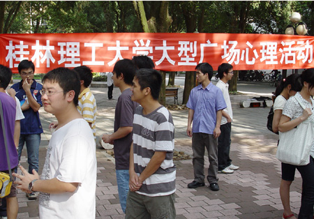 5月25日下午,由学生工作处心理健康教育与咨询中心主办,机械与控制工程学院、材料科学与工程学院、旅游学院、理学院、人文社会科学学院承办的2010年“5·25”心理健康教育月系列活动之大型广场心理活动在学校屏风校区启动。学校党委副书记王赣华,学工处有关负责人、部分学院团委书记和辅导员出席了此次活动。 王赣华副书记观看了同学们精心制作的各种童年玩具和现场的“心情对对碰”、“心灵手抄报”、“自我激励格言设计”等活动,并饶有兴趣地参与到“童年回忆-拾起最初的梦想”的活动中。活动现场人头攒动,同学们都积极参与到活动中,回忆起快乐的童年,在轻松愉快的心情下了解和掌握更多的心理健康知识,重拾童年梦想。 在此之前,学校于5月21日还在雁山校区举办了“5·25”心理健康教育月系列活动启动仪式暨大型广场心理活动。我校2010年“5·25”心理健康教育月时间从5月15日到6月15日,大型广场心理活动仅是我校“心理健康教育月”系列活动的序曲,随后有更加丰盛的心理大餐等着同学们,包括心理影片赏析、大学生职业规划设计大赛、心理情景剧大赛、心理健康知识讲座、心理素质拓展活动等。 每年5月和11月都是我校“心理健康教育月”,系列活动的开展是我校心理健康教育和宣传的重要形式和组成部分。除定期开展此项活动外,我校心理健康教育与心理咨询中心不断健全学校层面的心理健康教育相关制度,进一步完善四级心理健康教育与防控网络体系和措施,保证了学校心理健康教育工作的落实,促进了我校心理健康教育工作的整体提升。