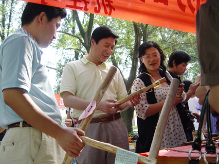 王赣华副书记(左二)在活动中观赏同学们精心制作的童年手工玩具——弹弓