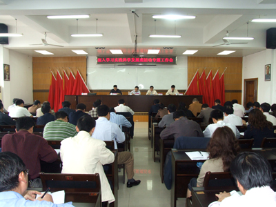 4月15日上午,学校在党校会议室召开深入学习实践科学发展观活动专题工作会议。学校党委副书记、校长、学习实践活动领导小组副组长赵艳林同志主持会议,学校党委书记、学习实践活动领导小组组长黎志逘同志,学校党委副书记、学习实践活动领导小组副组长张学洪同志,学校党委副书记、纪委书记、学习实践活动领导小组副组长赵君同志出席会议并在主席台就座,学习实践活动领导小组及办公室成员,各党总支、直属党支部、分党委书记,各单位(部门)学习实践活动领导小组办公室主任、各职能部门主要负责人参加了会议。 在会上,赵君副书记传达了全区高校深入学习实践科学发展观活动工作会议精神,材化系党总支书记胡祖生同志就材化系党总支开展学习实践活动作了典型发言。 黎志逘书记在会上发表了讲话,对学习实践活动前阶段工作进行了总结,并就推进学校学习实践活动深入健康开展作了工作部署。黎书记在讲话中指出,我校作为开展深入学习实践科学发展观活动第二批单位,在学习实践活动第一阶段工作中,严格按照自治区党委的有关部署安排,紧紧围绕学校中心工作,认真制定学习实践活动实施方案,确定了活动主题,按照“党员干部受教育,科学发展上水平,人民群众得实惠”的总体要求,紧密联系学校更名为“桂林理工大学”后如何发展和中央、自治区提出的“保增长、保民生、保稳定”的客观实际,突出实践特色,扎实有效推进,切实做到组织领导到位、谋划准备到位、工作方案到位、动员部署到位、学习培训到位、舆论宣传到位、督促检查到位,较好地完成了阶段性任务,取得了明显成效,学校学习实践活动开局良好,进展顺利,学习认真,成效显著。 全校党员干部一是进一步理清了工作思路,二是坚定了科学发展的信心,三是形成了办好理工大学的思想共识,增强了做好工作的紧迫感,四是进一步加强了党性锻炼和党性修养,进一步转变了工作作风。 就如何认真贯彻落实全区高校深入学习实践科学发展观活动工作会议精神,切实推进学校学习实践活动深入健康开展,黎志逘书记讲了以下几点意见:第一,要紧密联系学校实际、突出实践特色。要紧密联系桂林工学院更名为桂林理工大学后,如何推进桂林理工大学发展,怎样建设桂林理工大学这一实际,紧密联系如何提高教学质量、如何做好管理工作、如何加强师资队伍建设等工作实际,认真学习,认真思考,从自身做起,全身心投入到学校发展建设中来。第二,要更加密切联系当前的形势任务开展活动。要联系金融危机对经济社会发展与稳定的不利影响,按照中央提出的“保民生、保增长、保稳定”的要求,在抓好教学工作的同时,全力做好毕业生就业工作,全力抓好服务地方经济建设工作,全力抓好校园安全稳定工作。第三,学习实践活动要力戒形式主义,注重解决突出问题,务求取得实效;第四,要区别情况加强分类指导,切实加强活动的领导,注重典型引路;第五,要更加注意学习实践活动的重点对象。要重点抓好校、系院两级领导班子成员的学习实践活动,对于普通党员,主要是正面教育,就是认真学习中央规定的必读书目,积极参与提出科学发展建议和分析评议意见,立足本职模范地做好工作,在师生员工中起先锋模范作用。黎志逘书记还就做好学习实践活动学习调研阶段下一环节即调研环节的工作作了指示,要求各系、院和职能处室领导班子,要围绕本单位、本部门的工作实际,认真制定好调研题目,深入到师生员工中去,认真听取意见和建议,按照学校党委的部署,扎实开展好调研活动。 赵艳林校长作了总结讲话,要求与会同志要认真学习和体会黎书记的讲话精神,并贯彻落实到实际工作中去。赵校长指出,学习实践科学发展观活动意义重大、影响深远,对国家来讲,关系到国家的全面协调可持续发展,对我们学校来讲同样也关系到我们学校全面协调和可持续发展。这次学习实践活动非常突出的特点就是结合实际,推动工作,体现实效性。我们现在已经成功地更名为桂林理工大学,成功地被列入到博士点建设单位,我们的下一步工作,就是要按照黎书记讲的,要用科学的发展观作指导,要紧紧地围绕“如何办理工大学、如何办人民满意的理工大学”这一目标,来认真思考我们学校的下一步发展。只要我们从自己做起,从现在做起,从每件事情做起,只要大家都能够围绕着“建设人民满意的理工大学”这一目标,去认真思考,去扎实工作,我们这次学习实践科学发展观活动就能够真正取得实效,这也是我们这次开展学习实践活动的出发点和落脚点。最后,赵艳林校长表示,只要用科学发展观来统领我们的思想,统领我们的行动,在学校党委、行政的领导下,在大家的共同努力下,我们桂林理工大学的明天一定会更加美好。