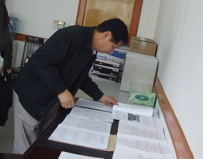 指导检查组同志听取工作汇报(左:梁启光,右:刘红)