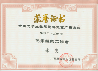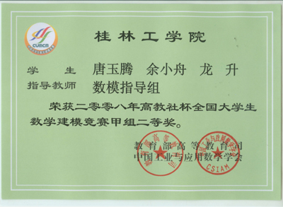 近日,2008“高教社杯”全国大学生数学建模竞赛结果揭晓,我院以荣获国家一等奖1个,二等奖4个,广西赛区一等奖5个、二等奖12个、三等奖6个的优异成绩名列广西前茅。同时,我院获得“2005——2008年全国数学建模竞赛广西赛区优秀组织学校”荣誉称号。数理系林亮教授获得“全国数学建模竞赛广西赛区优秀组织工作者”荣誉称号,数理系刘筱萍、蒋远营两位老师获得“全国数学建模竞赛广西赛区优秀指导教师”荣誉称号。 我院一直非常重视数学建模竞赛活动,近年来学院结合专业特点,大力开展学生专业技能竞赛活动,为学生提供了一个学以致用的平台,调动了学生专业学习的兴趣,提高了学生的专业素养、创新能力和职业竞争力。为更好的参加该项赛事,学院开设了数学建模公共选修课,精心安排数理系骨干教师对学生进行指导和培训。近四年来,我院共组织了77个队参赛,获得全国一等奖4个,二等奖14个,各级获奖63个队,获奖率82%,名列广西首位。 在学院教务处、学院团委等有关单位的大力支持下,数理系制定了《2008年全国大学生数学建模竞赛参赛方案》,数学建模指导小组对参赛小组进行了精心培训,指导老师不惜放弃暑假休息时间培训参赛队员。我院大学生在比赛中迎难而上,展现勇于拼搏、团结合作的良好精神风貌,并交出了一份优异的答卷,为学校争得了荣誉。